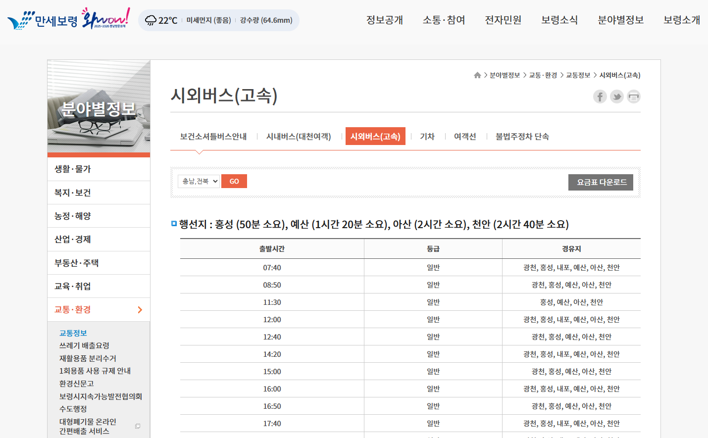 | 홍성종합터미널 | 08:00~21:10 (11회) | 일반 | 5,700원 | 40분 |